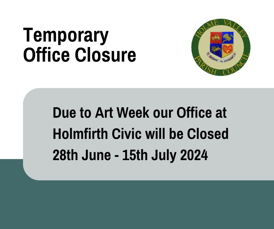 Due to Art Week our office at Holmfirth Civic will be closed from 28th June until 15th July 2024. Please contact the Clerk for access by appointment.