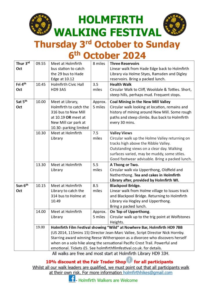 All walks are free and most start at Holmfirth Library HD9 3JH.10% discount at the Fair Trader Shop for all participants