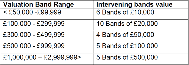 - for each postal sector level, the valuation data should be classified within set bands of value. Authorities must set their valuation bands within the general parameters set out in the table below, in light of the local characteristics of the housing market in their area, in order to ensure that valuation data published by all authorities is consistent and clear to understand:
